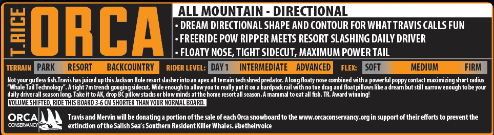 Travis and Mervin will be donating a portion of the sale of each Orca snowboard to the www.orcaconservancy.org in support of their efforts to prevent the extinction of the Salish Sea’s Southern Resident Killer Whales. #betheirvoice